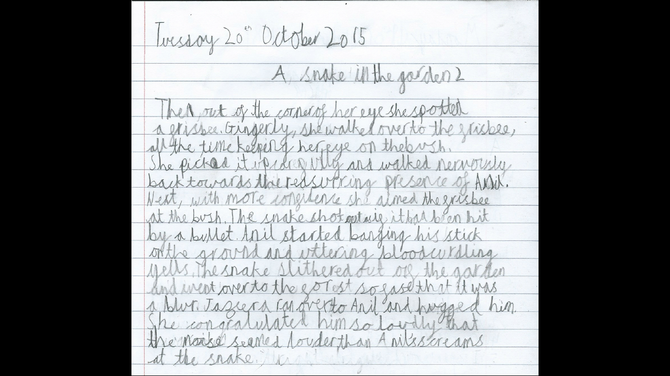 Then, out of the corner of her eye she spotted a frisbee. Gingerly, she walked over to the Frisbee, all the time keeping her eye on the bush. She picked it up carefully and walked nervously back to the reassuring presence of Anil. Next, with more confidence she aimed the Frisbee at the bush. The snake shot out as if it had been hit by a bullet. Anil started banging his stick on the ground and uttering blood-curdling yells. The snake slithered out of the garden and went over to the forest so fast that it was a blur. Jazeera ran over to Anil and hugged him. She congratulated him so loudly that the noise seemed louder than Anil’s screams at the snake.